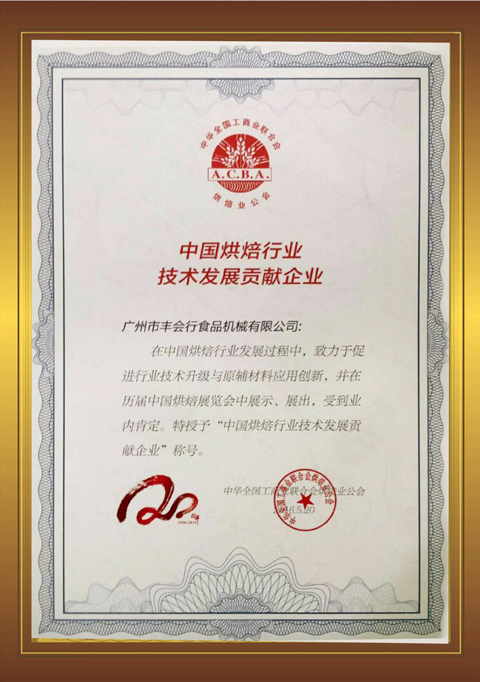 经过二十余年的沉淀,【丰会行】本着对食品机械的不断创新,对产品质量的严格要求,对客户的优质服务的经营理念,得到了《中华全国工商业联合会烘焙业公会》的肯定,在本次展会中特授予【丰会行】为“中国烘焙行业技术发展贡献企业”的荣誉。